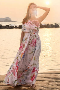 In this stunning beachside ensemble, the model radiates elegance in a flowing dress that captures the essence of nature's beauty. The dress features a delicate off-shoulder design, with fabric gracefully draping around the shoulders, adding a touch of romance to the look. The vibrant floral patterns, painted in shades of pink, red, and green, evoke a sense of a blooming garden, perfectly complemented by the soft, ethereal glow of the setting sun. This outfit is an ode to the beauty of nature and the effortless grace of summer evening