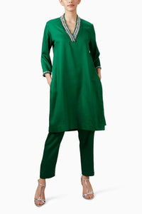 This emerald green kurta and pant set features intricate Swarovski encrustations on the neck and sleeves, with 800 stones in crystal white and emerald green. The relaxed-fit kurta with a side slit pairs with sleek ankle-length pants, offering a stylish, comfortable fit with an elasticized waistband and functional side pockets.