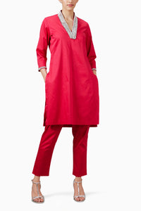 This rose kurta and pant set features intricate hand-crafted Swarovski encrustations on the neck and sleeves, with five lines of premium stones on the neck and two lines of paan-shaped stones on the sleeves. The kurta offers a relaxed fit with a side slit, while the sleek ankle-length pants feature a straight fit, elasticized waistband, and functional side pockets, combining modern style, comfort, and versatility.