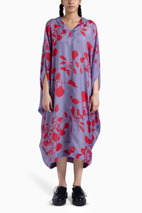 Eureka, a lilac-red Habutai kaftan adorned with a pear print, featuring a dramatic cowl neckline and natural neem dot detailing.