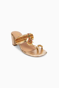 This pair of golden heel are here to add a pich of sparkle to your festive wardrobe with theri shiny golden base and the mix of serene pearls with rich rubies. it is the perfect footwear to jazz up any festive outfit with a much needed touch of finery.