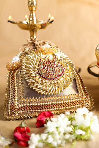This Evander gold potli is all about that sass with its bold, gota studded appearance and a captivating golden colour.There is also a dramatic embroidery of floral motifs and a charming design of kundan and ghungroo embellishements here that truly makes it the bag for the season.