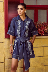 Invest in timeless style with this beautiful dark blue coord set. Crafted from premium Chambray fabric, this classic design boasts fine white details adorning the front. The pipings along the cuffs and hem add a delicate, vintage flair, while the Chambray fabric ensures a comfortable, relaxed fit.