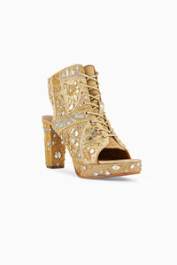 Our Everyday Runway boss boots are crafted in shimmery gold fabric and adorned with various Indian handicrafts. The mirror work adds our signature opulence to the design, while the gold and silver dabka pitta work elevates it. The shoe also features dainty nakshi and zari embroideries.