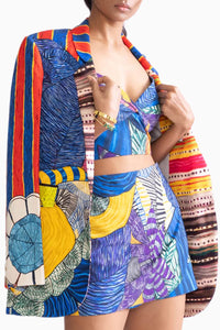Featuring Evie Multi Blazer by Saaksha & Kinni from Botanica Collection. This tribal print wide collared blazer adorns a striking tribal pattern and a bold wide collar. Its unique design adds a touch of sophistication and cultural flair to any outfit, perfect for making a statement.