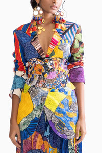 Featuring Evie Multi Printed Blazer by Saaksha & Kinni from Botanica Collection. Tribal print wide-collared blazer showcasing a bold pattern with a commanding presence. The wide collar adds a distinctive touch, making this piece a standout in any wardrobe.