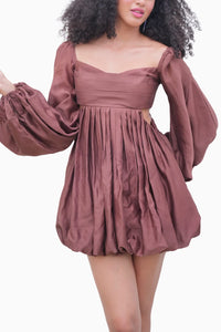 Expresso Martini is a mini dress with a flirty silhouette, plunging neckline and pleating done at the bust. This dress also features voluminous sleeves and cut-outs on both sides of the waist. The skirt of the dress falls from the waist in hand-done pleats, adding volume to the look and featuring a flattering balloon hem. The dress is the epitome of romanticism.