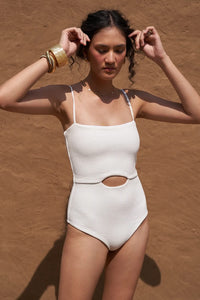 Meet the Eza White One Piece, designed for sculpting comfort with premium Compressive Fabric. Featuring a stylish square neckline and elegant cut-out detailing, this one-piece offers thin straps for a sleek silhouette while providing full coverage at the bottom. Perfect for beach days or poolside lounging, it combines fashion and functionality effortlessly!