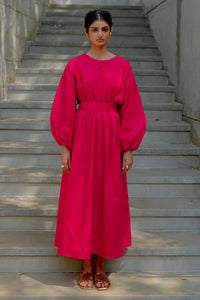 The Fable Dress brings bold femininity into focus. Crafted in structured cotton, it features a wide waistband that cinches the gathered bodice and skirt into a flattering silhouette. Billowed sleeves and a rich pop of color lend an expressive touch effortless yet elevated for day-to-evening transitions.