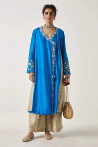 The Falak Neelambari Kurta and Farshi are crafted in luxurious handwoven silk brocade with pure silk and gold-plated zari. Inspired by Art Deco jaal motifs, the ensemble features heritage dabka and zardozi embroidery, intricate floral vines, and a silhouette reminiscent of the classic angarkha for timeless elegance.