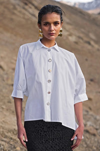 Boxy fit front button down shirt in white organic cotton poplin with dolman kaftan-inspired sleeves. Soft ruching at the sleeves. Each button is unique with varied designs placed along the front. Shirt collar. Relaxed fit. High-low hem.