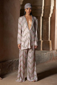Crystal-embellished chevron print blazer and pant set in shades of pink along with a matching headgear accessory.