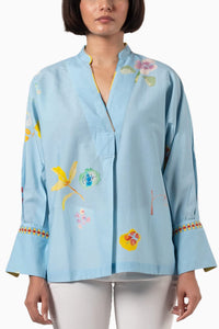 Featuring Farm Rio Top from Shades of India by Cinnamon Collection. This top boasts a luxurious silk-cotton blend adorned with a delicate floral print on a charming blue base. Intricate hand-woven details elevate the design.
