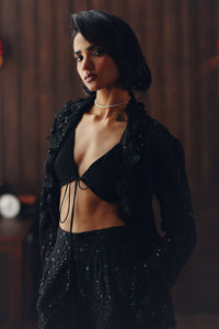 Featuring the Fasana Bandeau from Twenty Nine India, this midnight black tie-up bandeau offers a sleek and minimal silhouette. Designed for versatility and comfort, it pairs effortlessly with layered or statement pieces, making it a chic essential for contemporary festive and formal styling.