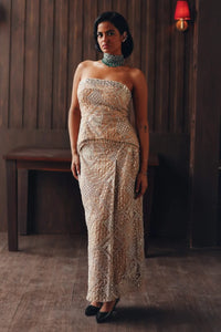 Featuring the Box Pleat Skirt from Twenty Nine India, this haze golden tulle skirt is adorned with intricate mirrorwork and beadwork. The structured box pleats create graceful movement and a flattering silhouette, making it a perfect blend of elegance and shimmer for festive or formal occasions.