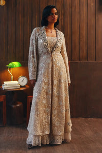 Featuring the Fasana Long Blazer Set from Twenty Nine India, this blush-toned ensemble includes a hand-embroidered long blazer with mirrorwork and beadwork on tulle, coordinated bootcut pants, and a matching bandeau with elastic back. Together, they create a refined, modern look with traditional detailing—perfect for festive and formal occasions.