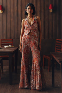 Featuring the Rust Bootcut Pants from Twenty Nine India, these rust-colored tulle pants are embellished with intricate mirrorwork and beadwork. Designed in a flattering bootcut silhouette, they offer a perfect blend of modern style and traditional elegance for a chic and comfortable festive look.