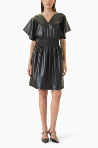 Flattering faux leather smoked waistline dress. Perfect to pair those knee high boots.