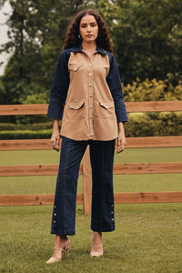 A classic button down shirt with denim sleeves paired up with straight fit denim