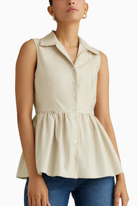 The sleeveless cotton top with collar in fawn is crafted from 100% Egyptian Giza Cotton with a luxurious 120/2 thread count, enhanced with refined mother of pearl buttons, and thoughtfully designed to be fitted at the bust while gathered and flared at the waist for an elegant, feminine silhouette.