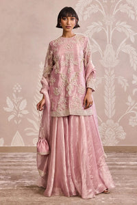 Light and breezy, the Faza Kurta Set features intricate all-over embroidery on ethereal tissue fabric. Matched with a plain tissue sharara and a slim tissue dupatta with two-sided embroidered borders, it offers effortless charm- ideal for graceful daytime celebrations and warm-weather festivities.
