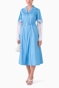 Introducing the Felina Sky Blue Cotton & Dobby Dress—a charming blend of comfort and style. This cotton dress features eye-catching 3D floral embroidered colorblock sleeves that add a playful touch. With practical side pockets and stylish twill tape details, it’s as functional as it is fashionable. The elasticated belt with a buckle enhances your silhouette while ensuring a relaxed fit. Perfect for any occasion, this dress is a must-have for your wardrobe!