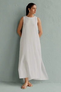 Featuring the Femma White Maxi Dress by Anaash's AUR collection. Crafted in breathable white linen, this relaxed fit dress exudes quiet elegance. Its flowing silhouette and timeless simplicity make it a perfect choice for sunlit days, offering effortless charm and comfort in every movement.