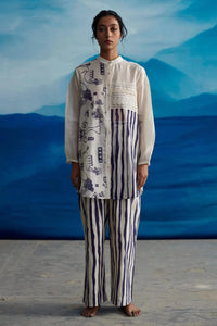 Introducing the enduring mandarin collar shirt, meticulously hand-screen printed with intricate patterns and adorned with delicate lace details The shirt exudes timeless elegance with its refined silhouette and traditional collar style. Hand-screen printed patterns and Delicate lace accents add a unique touch, showcasing meticulous craftsmanship and attention to detail. Accompanying the shirt are the Lilian classic pants, renowned for their tailored fit and versatile design. These pants embody sophistication with a clean, straight-cut silhouette that flatters the figure and ensures comfort throughout the day.