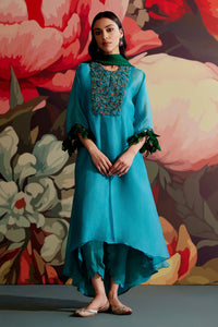 Experience the elegance of the Feroza Kurta Set, a turquoise silk organza and crepe ensemble. It includes a flowing kaftan, tailored tulip pants, and a graceful dupatta, adorned with intricate floral Dori and Zardosi embroidery—ideal for weddings, festivals, and special occasions.