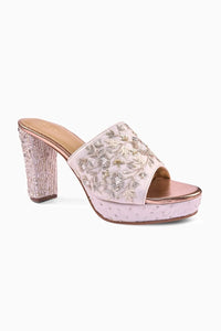 They feature a rich medley of zardozi, cutdana, and zari work, embellished with rose gold, silver, and white beads that come together in a delicate floral design on the luxurious ivory satin strap. To take the glamour to the next level, even the block heel is bedazzled with beads. What’s not to be head over heels in love with?