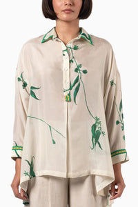 Featuring Fico from Shades of India by Cinnamon Collection. This top stuns with an abstract leaf design on silk habutai. Hand-woven details and green piping hint at its intricate artistry.