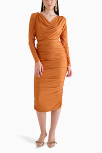 Featuring a chic cowl neckline and full sleeves with shoulder pads, the Fina Co-ord Set by House Of Exotique offers sophistication. The bodysuit, with a snap button fastening, pairs elegantly with the skirt, boasting an elasticated waist and ruching details in a pencil fit silhouette. Crafted from jersey fabric in a rich rust hue, this ensemble combines comfort with style.