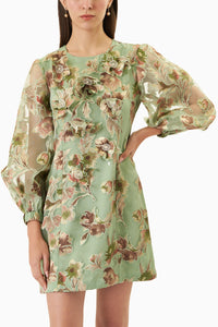 This stunning organza brasso dress features flouncy sleeves and intricate 3D embroidery, creating a beautiful blend of texture and elegance. Perfect for adding a touch of glamour to any special occasion.
