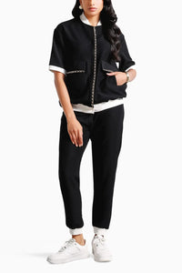 A British twill black coord set with contrast off-white rib detailing and stylish chain accents.