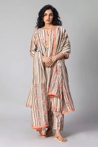 Fiora Dupatta in mud natural, this dupatta is beautifully divided into three panels, adored with a romantic floral chintz print and featuring a fun pop of peach for the border.