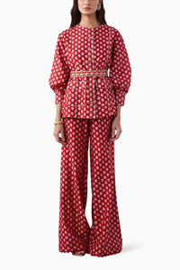Ignite your style with Fioralba Red Boota printed anchor detailed shirt and flared pants, perfectly paired with an anchor detailed belt. Crafted from luxurious Chanderi fabric, this 3-piece ensemble showcases vibrant colors and intricate detailing.