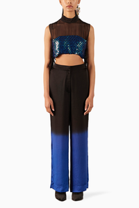 The Firefly Top & Trousers Co-ord crafted from our stunning Vegan Silk fabrication, trans-seasonal, is a statement piece. The top, made in our hand dyed organza, is part of a 2 piece set. With a pleated collar and embroidered sequin in two tones, it is chic. Featuring side knots, this shirt can be styled in different ways. Paired with our Ombre dip dyed Blue Black Trousers with pockets. Wear it with heels for an elegant look.