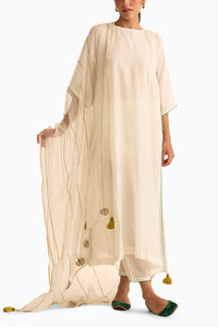 Featuring Ishani Ivory Kaftan Kurta Set in Cotton Silk Fabric. It Comes Along With Straight Silk Pants and Jhoomar Dupatta to complete the Ensemble.