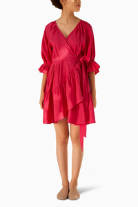 Featuring a fuchsia pink double cotton wrap dress with front tie-up opening. The wrap dress comes with smocking detailing at the sleeves hem.