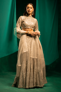 The georgette mirrorwork fabric is specially designed by our team and crafted with great care and precision. With the floating mirror effect of jaaliwork, the garment is then styled at our workshop with finest details. We recommend dryclean only.