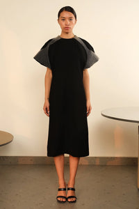 The Fish Gill Overlay Dress is a black A-line design with a clean, structured silhouette. Sculptural raglan sleeves are elevated by hand-embroidered loop detailing in Monet green PVC cords, creating a vibrant, textural contrast. A concealed mid-back zipper ensures seamless closure.