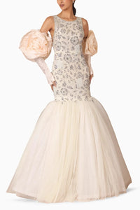Presenting Shriya Som's bridal gown from the Chrysalis Collection, crafted in a tulle base and adorned with dazzling multicolor crystals. Featuring a unique fishtail pattern, this exquisite design embodies elegance and timeless charm, perfect for a modern bride.