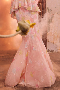 Featuring a fishtail skirt crafted from ethereal tulle, this design is adorned with multi-color gitch embroidery that adds a vibrant and intricate touch. The fishtail silhouette gracefully flares out, creating a dramatic and elegant shape that moves fluidly. The multi-color embroidery enhances the skirt with a rich, textured pattern, making it a striking choice for any formal or special occasion.