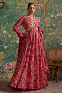 Step into timeless grace with our Printed Chiffon Long Anarkali, elegantly paired with a Net Dupatta. This exquisite ensemble features a beautifully adorned yoke with intricate floral embroidery, adding a touch of feminine charm to the outfit. Perfect for special occasions and festive gatherings, the flowing silhouette of the anarkali promises both comfort and style. The lightweight chiffon fabric and delicate details make it an ideal choice for those who appreciate traditional aesthetics with a contemporary twist. Make a captivating entrance with this Anarkali that effortlessly combines elegance and grace.