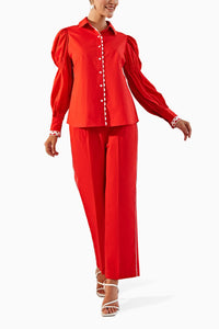This red colour cotton co-ord is ideal for any date. Features collared shirt with front opening and lace detailing in front and cuffs, rushed sleeves with extra gathers and flounce. Paired with wide leg pants with contrast piping.