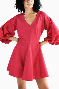 This hot pink mini dress is crafted in breathable poplin, designed to offer both style and comfort. It features puff sleeves that add a playful touch, a flattering V neckline, and godet flares at the hemline for a flowy, feminine silhouette. The vibrant color and chic design make it a perfect choice for a bold, effortless look.