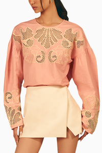 Features Flamingo Cutwork Embroidered Blouse by Boho Chic from Love Cabo Collection. Beautifully crafted in cotton linen, this summer blouse comes with Cutwork embroidery on the yoke and the sleeves.