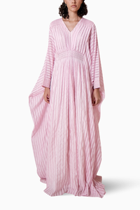 Introducing our gorgeous flared kaftan, featuring a beautifully hand-smocked waist and cuffs adorned with delicate beads. This kaftan is perfect for women who want to feel comfortable and stylish while making a statement.