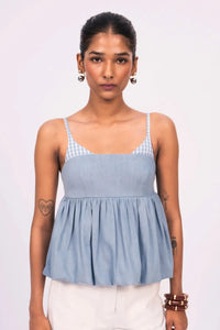 This stylish flared top is designed to elevate your everyday look with subtle yet striking details. It features delicate strap sleeves and a flattering bust dart that enhances your natural silhouette. A contrast gingham neckline adds a playful, vintage-inspired touch, while the minimal flare at the hem gives it a graceful, easygoing movement.