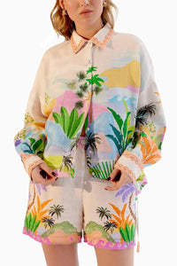 Introducing the Fleur Shirt that is crafted from lightweight linen viscose, it features the vibrant By the Sea placement print that captures the essence of coastal charm. Thoughtful embroidery detailing on the collar and cuffs adds a touch of elegance, while the drawstring at the front bottom hem creates a flattering ruching effect for a unique silhouette.